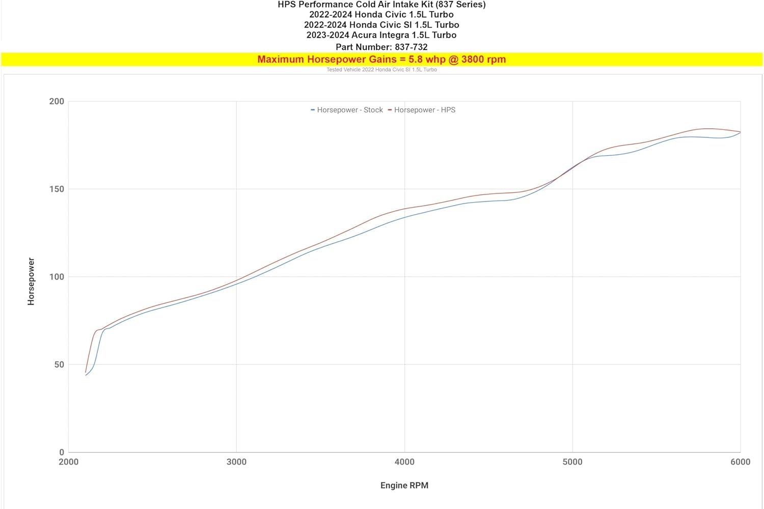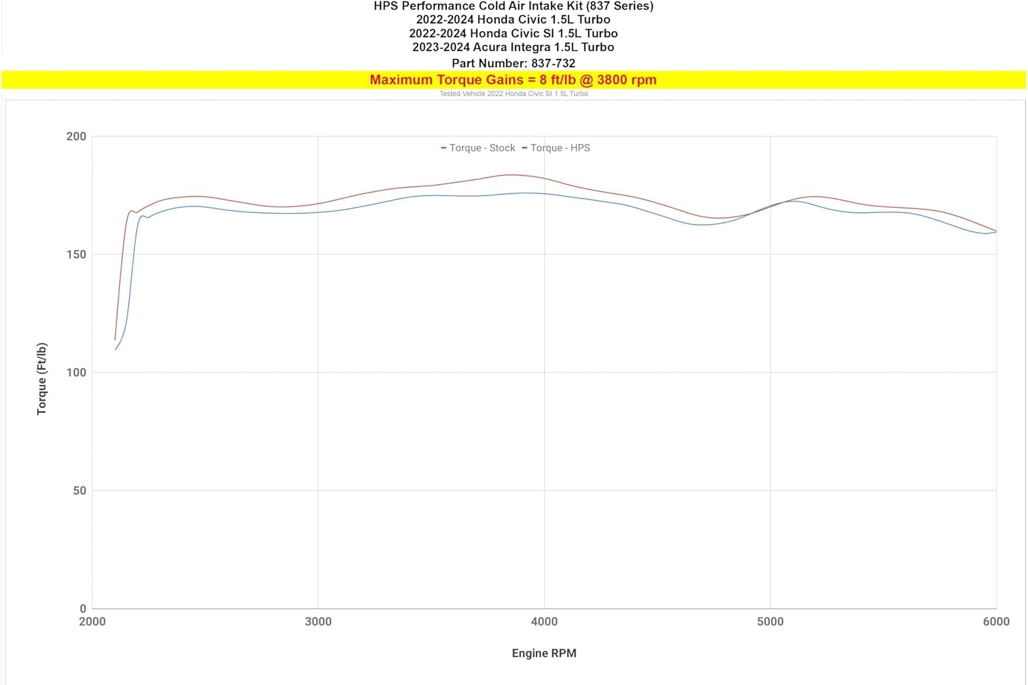 On the dyno, the Acura Integra HPS Cold Air Intake (837-732BL) showed up to +9 horsepower and +10 lb-ft of torque on the 1.5L turbo engine — all while maintaining OEM reliability and driveability.