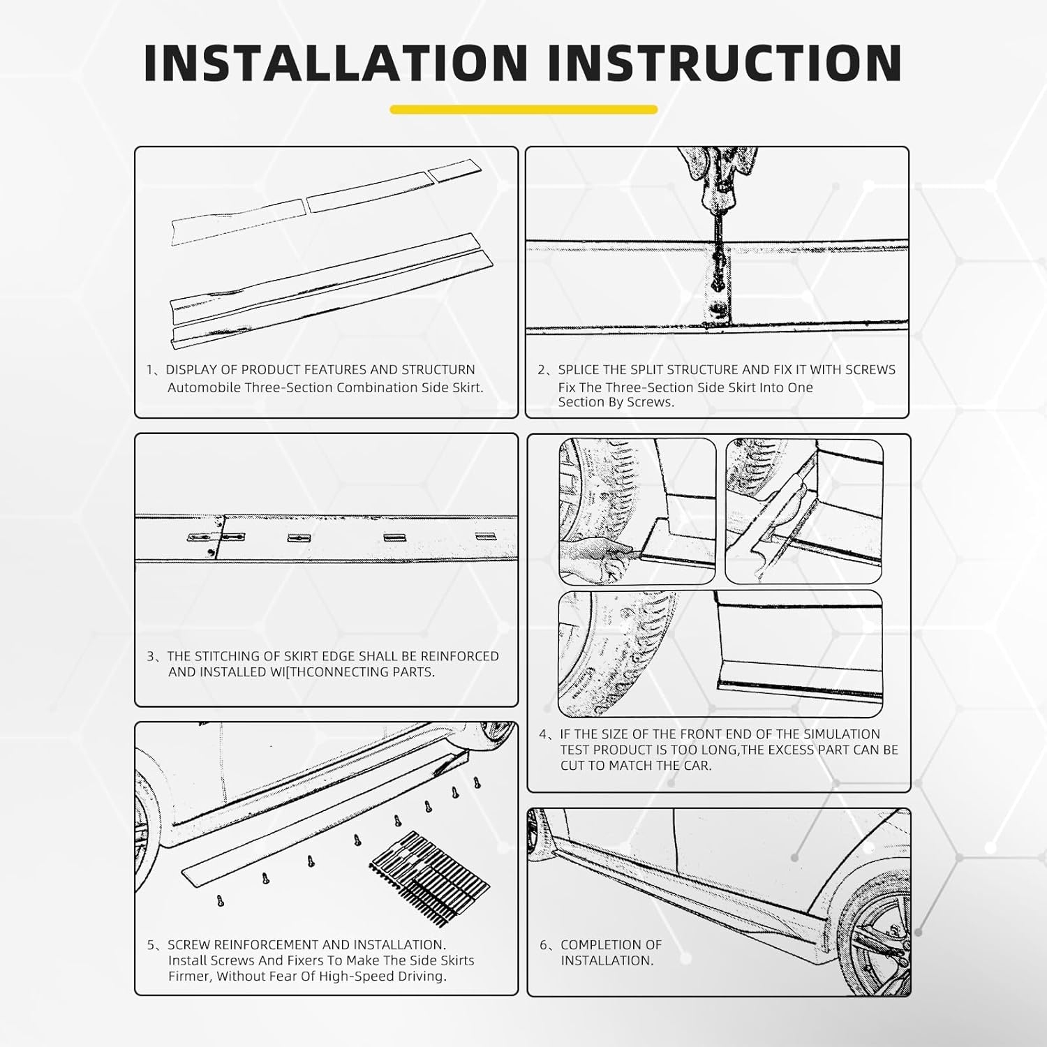 Universal fitment requires test fitting and measurement before install. Trimming may be required to achieve proper length and alignment. Professional installation is recommended — long skirts amplify crooked installs instantly.