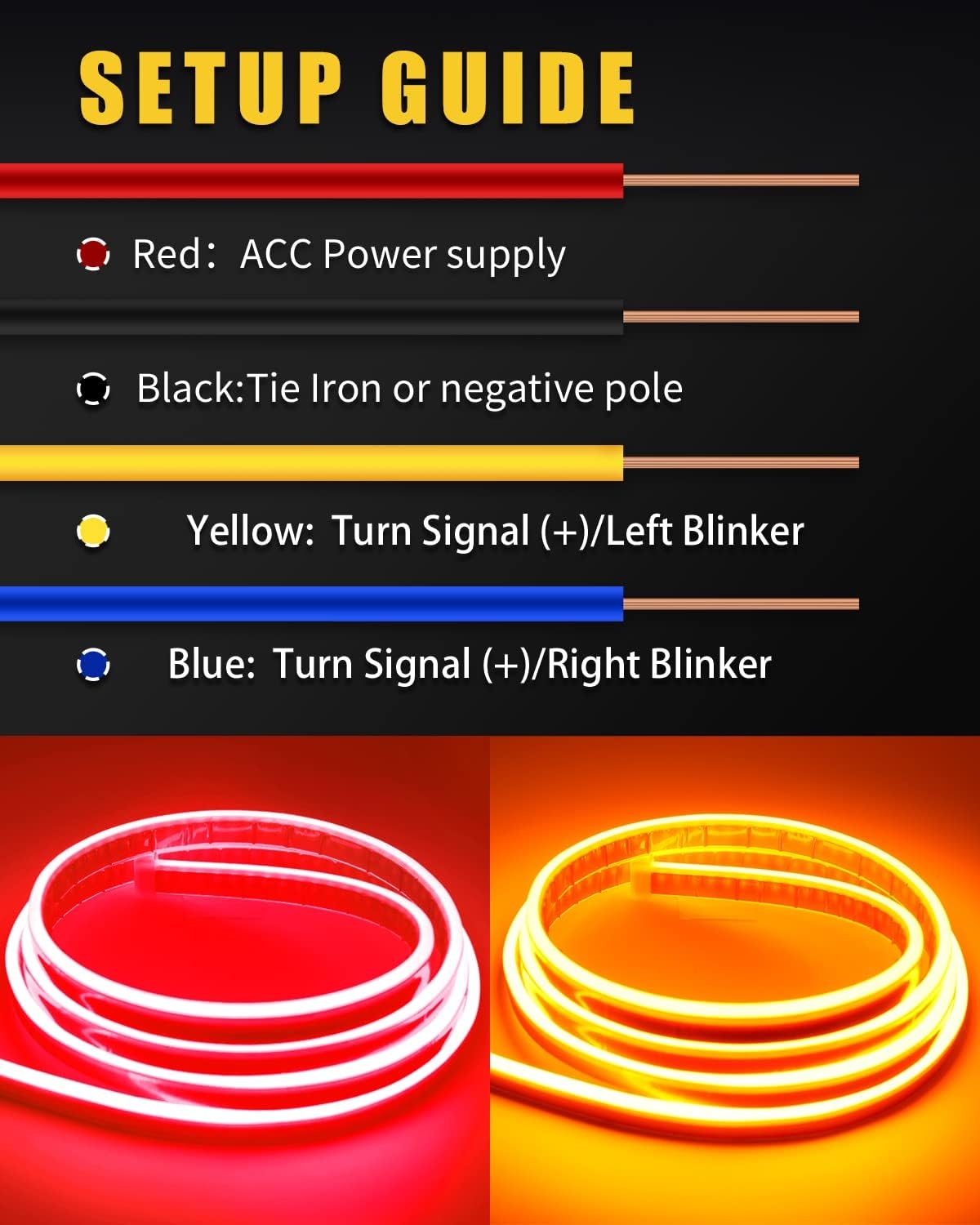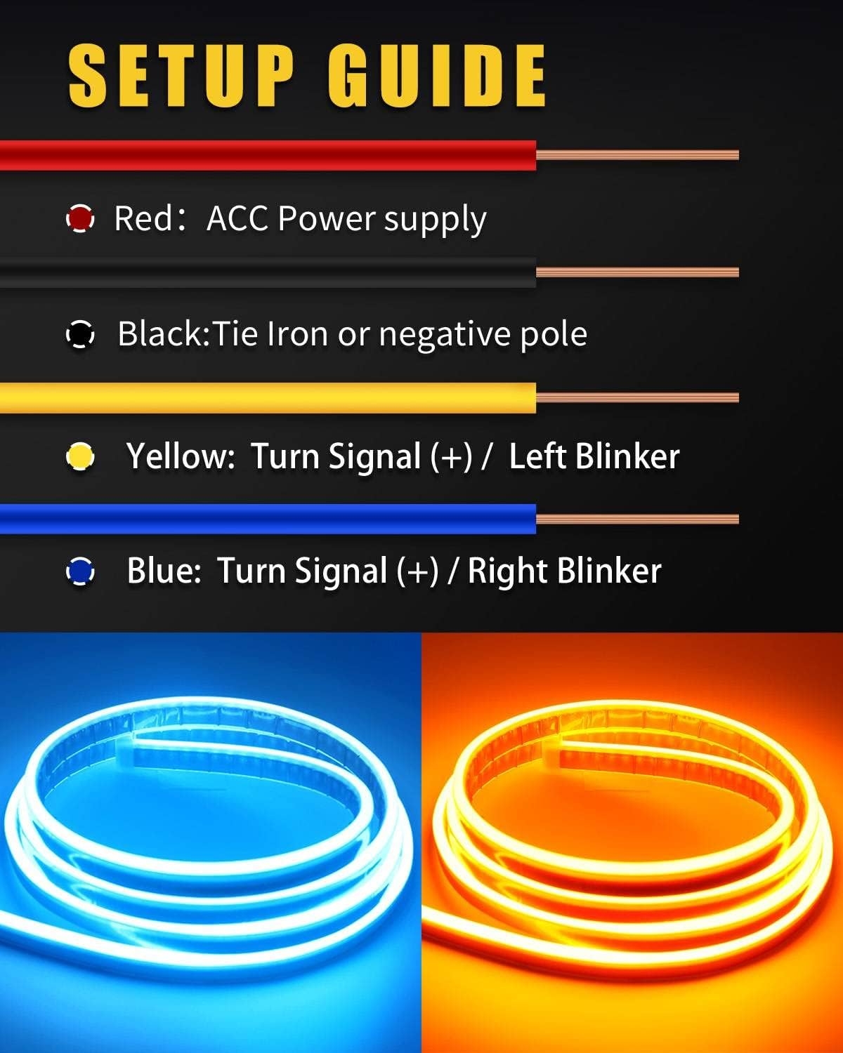 1. Depending on car models . Mostly is like this way : take off the turn signal Wiring Harness, find out the turn signal wire by a test pencil ,the flashing one is turn signal bulb wire . splice the turn signal cable in order to sync it with led strip .