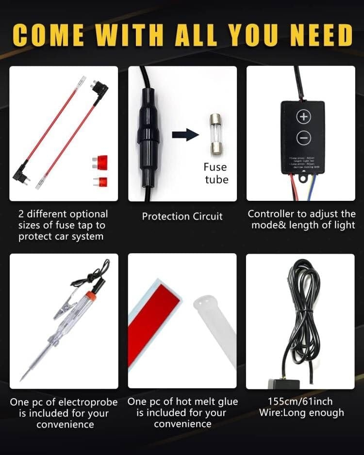 Fairly good looking light. As others have said, the right side wire for the turn signal could be longer. Love that there was a test light that comes with it. Helped out tremendously. The double sided tape was on both sides for some reason. Could be if once side gets messed up you just flip it over and try again? Maybe to stick the hood seals to it? No clue. Either way it’s nice to have a backup in case. Easy to switch modes, but there are only two. Also easy to change the length on the turn signal. It start from the middle which you can change to start closer to you actual signals or headlights.