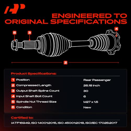 [Specifications]: ① Location: Rear Right (Passenger Aspect); ② ABS Ring Included: No; ③ Axle Nut Included: Yes; ④ Spindle Nut Thread Size: M27 x 1.5; ⑤ Compressed Length: 26.18 inch; ⑥ Input Shaft Bolt Count: 6; ⑦ Output Shaft Spline Count: 30