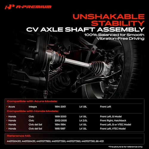 Specification: A-Premium CV Axle Shaft Assembly Compatible with Acura Integra 1994-2001 & Honda Civic 1999-2000/2002-2005, Civic del Sol 1994-1997, 1.6L 2.0L 1.8L, Replace# 44011S04J01, 44011S04J51