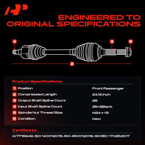 [Specifications]: ① Location: Front Right (Passenger Aspect); ② ABS Ring Included: No; ③ Axle Nut Included: Yes; ④ Spindle Nut Thread Size: M24 x 1.5; ⑤ Compressed Length: 24.13 inch; ⑥ Input Shaft Spline Count: 25+2Blank; ⑦ Output Shaft Spline Count: 28