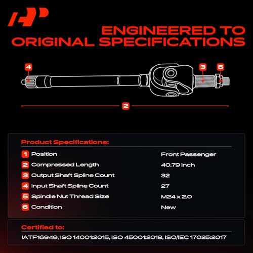 [Specifications]: ① Location: Front Right (Passenger Facet); ② ABS Ring Included: No; ③ Axle Nut Included: Yes; ④ Spindle Nut Thread Size: M24 x 2.0; ⑤ Compressed Length: 40.79 inch; ⑥ Input Shaft Spline Count: 27; ⑦ Output Shaft Spline Count: 32