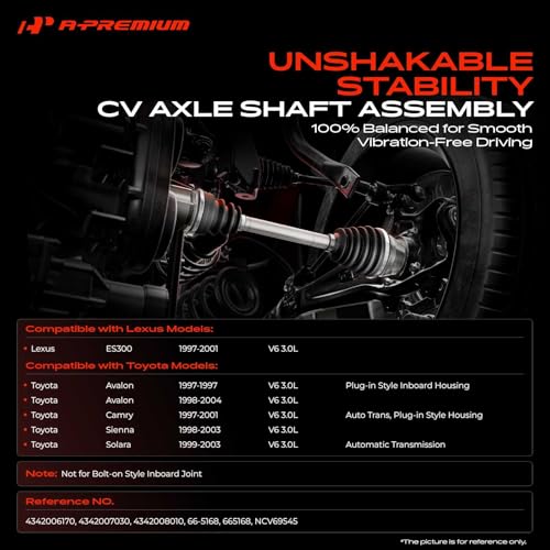 [Vehicle Fitment]: Compatible with Lexus ES300 1997-2001 V6 3.0L; Compatible with Toyota Avalon 1997 V6 3.0L (Plug-in Style Inboard Housing), Avalon 1998-2004 V6 3.0L, Camry 1997-2001 V6 3.0L (Automatic Transmission, Plug-in Style Inboard Housing), Sienna 1998-2003 V6 3.0L, Solara 1999-2003 V6 3.0L (Automatic Transmission) — Not for Bolt-on Style Inboard Joint