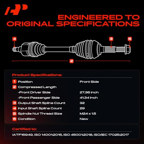 [Specifications]: ① Location: Front Left and Right (Motive force and Passenger Aspect); ② ABS Ring Included: No; ③ Axle Nut Included: Yes; ④ Spindle Nut Thread Size: M24 x 1.5; ⑤ Compressed Length: 27.36 inch (Left), 41.34 inch (Right); ⑥ Input Shaft Spline Count: 29; ⑦ Output Shaft Spline Count: 32