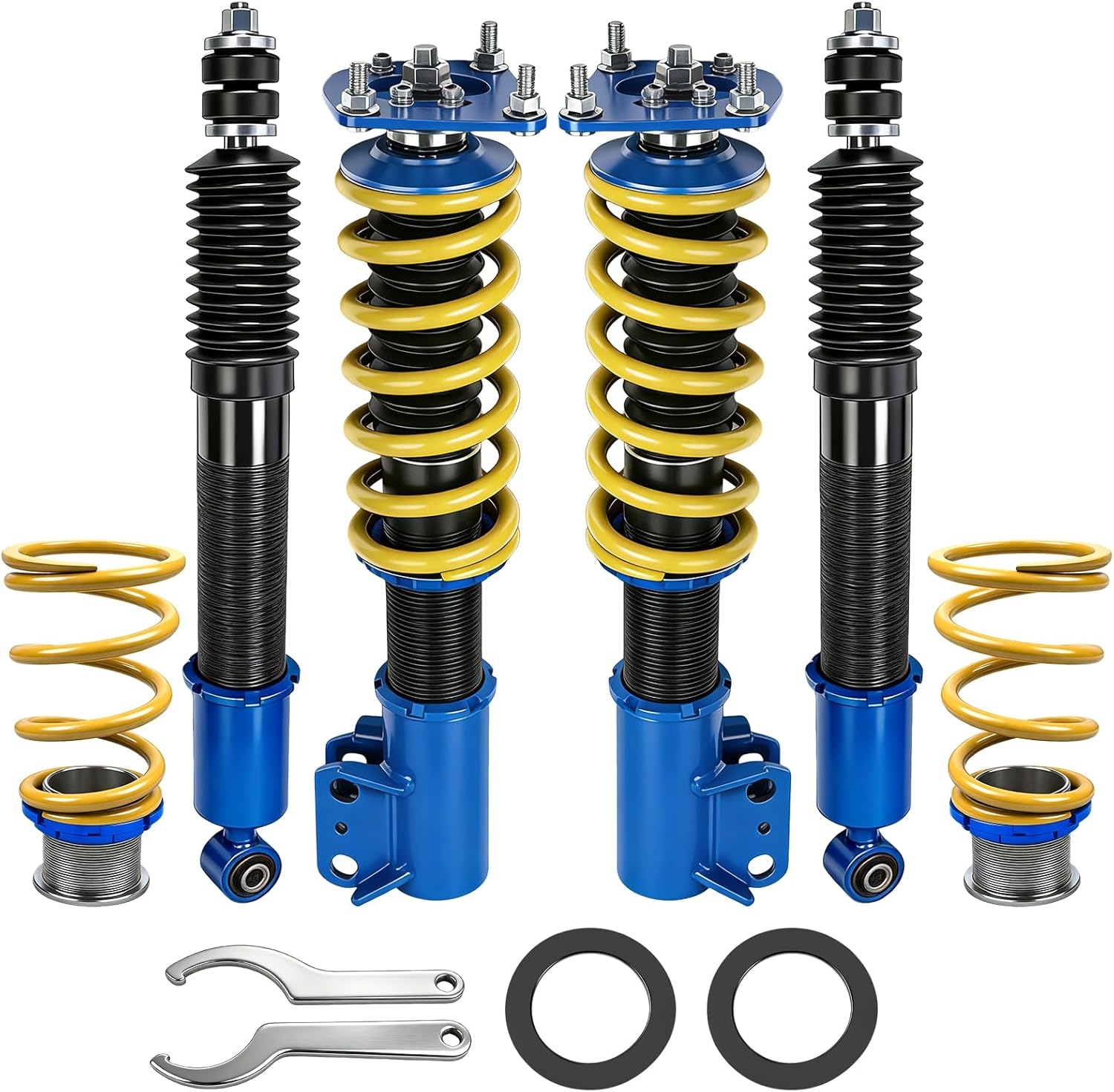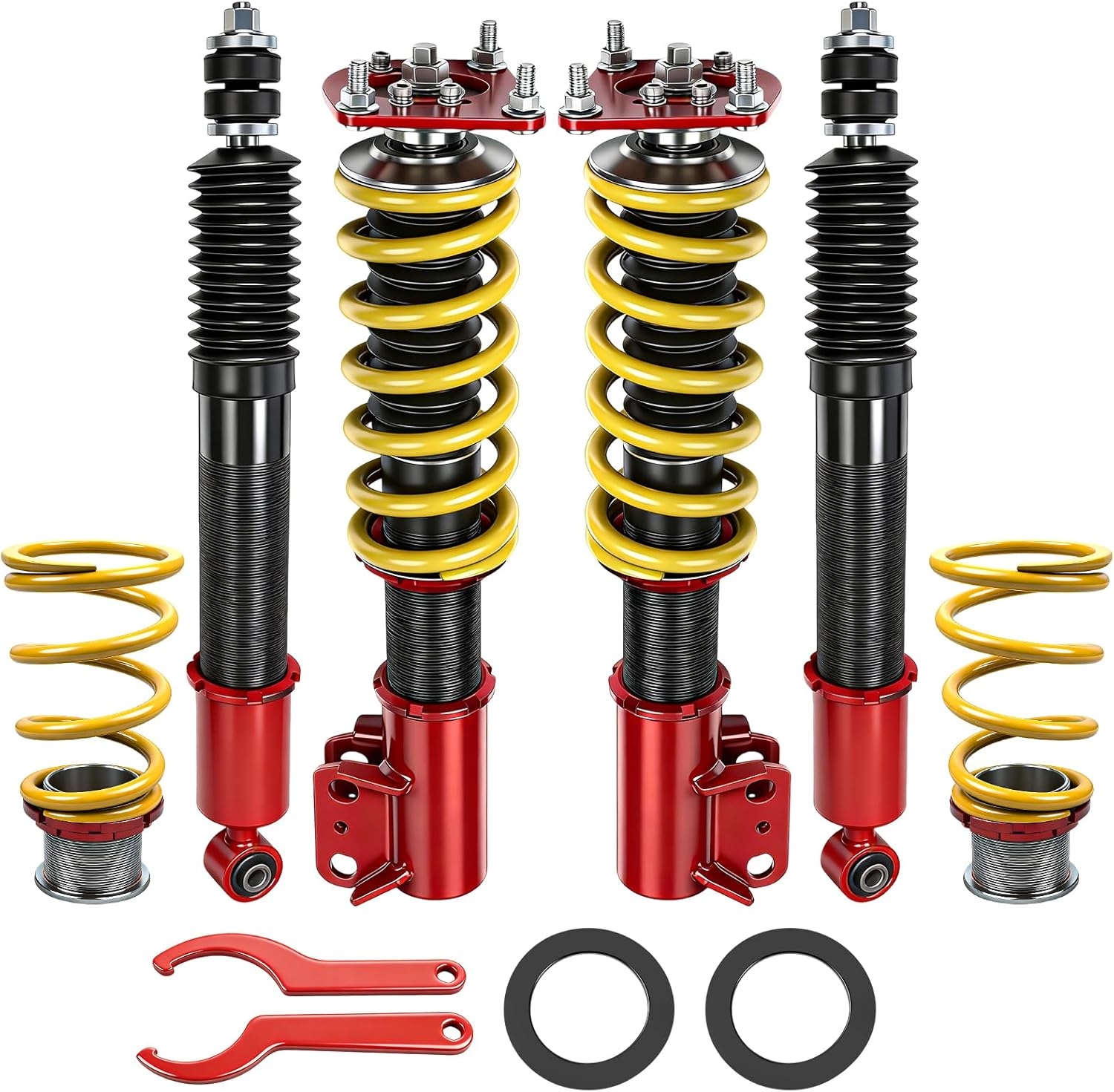 This setup combines the coil spring and shock absorber into a single adjustable unit, allowing ride height tuning while improving damping control over worn OEM parts.
