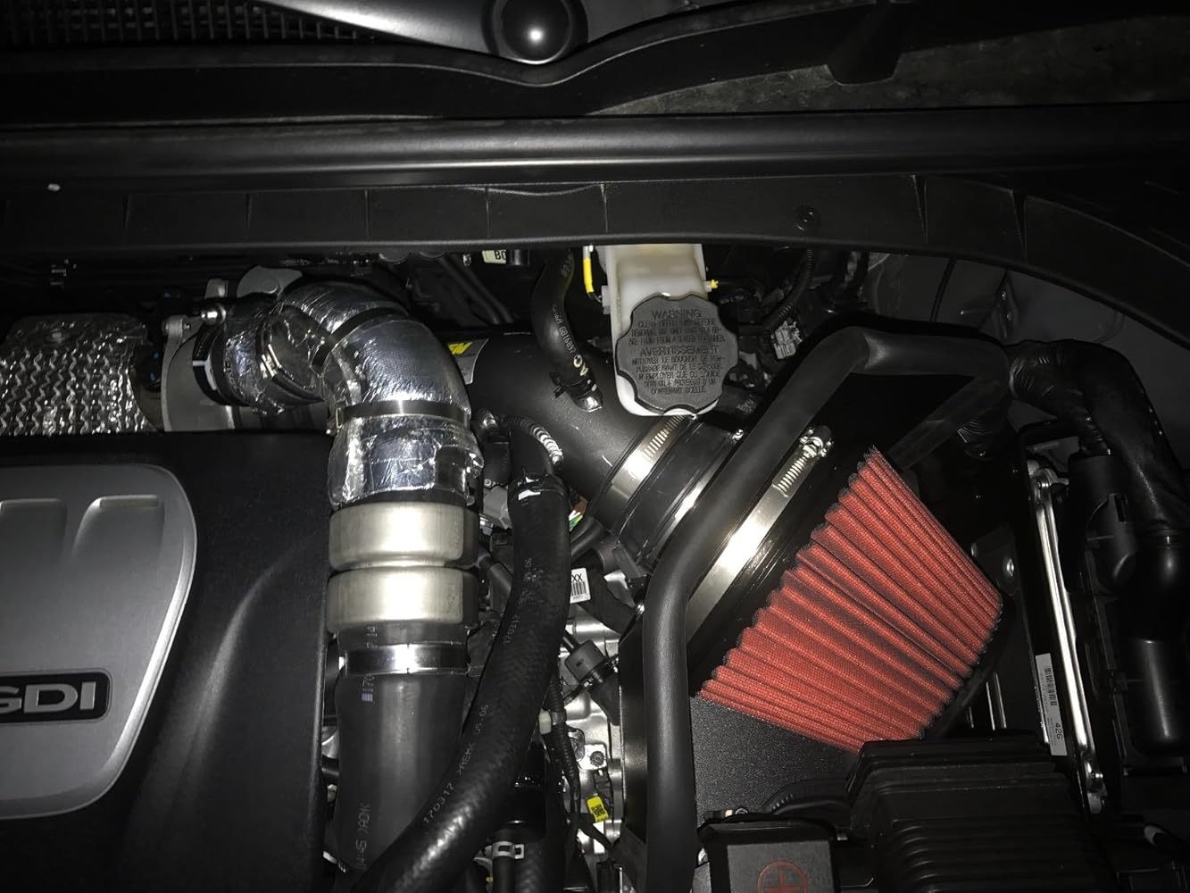 The filter is located in the original air box area, protected by a heat shield, to reduce intake air temps and preserve performance under load.
