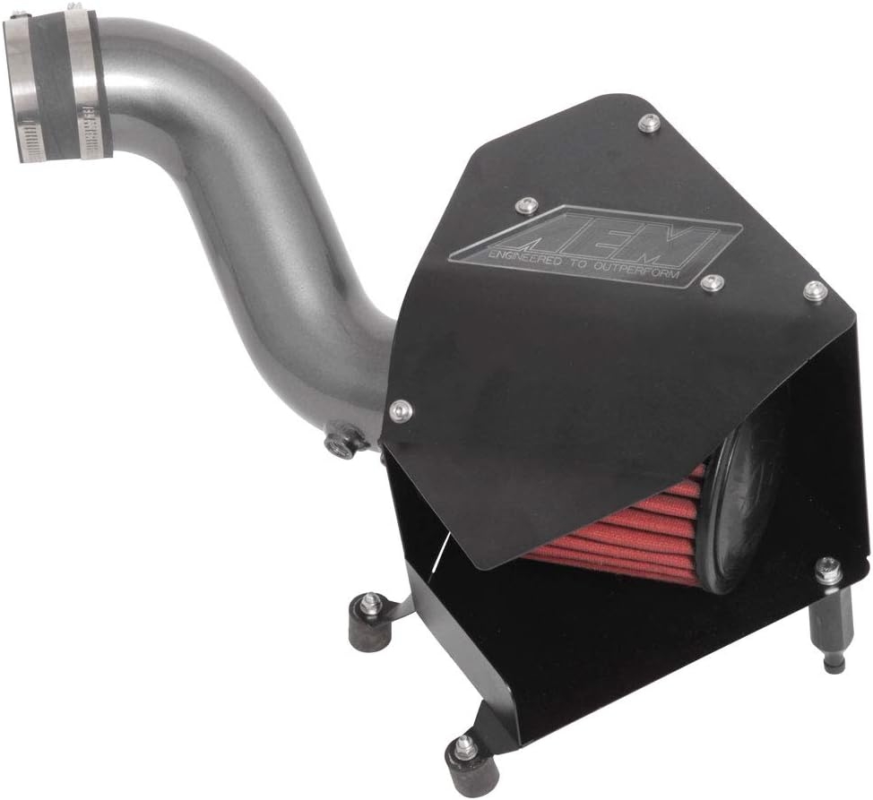 Air enters the system through an oversized AEM Dry flow synthetic washable air filter for outstanding air flow, filtration and performance. The air intake tube is constructed from mandrel-bent aluminum featuring a durable gunmetal gray powder coated finish. A custom shaped heat shield with lid is included.