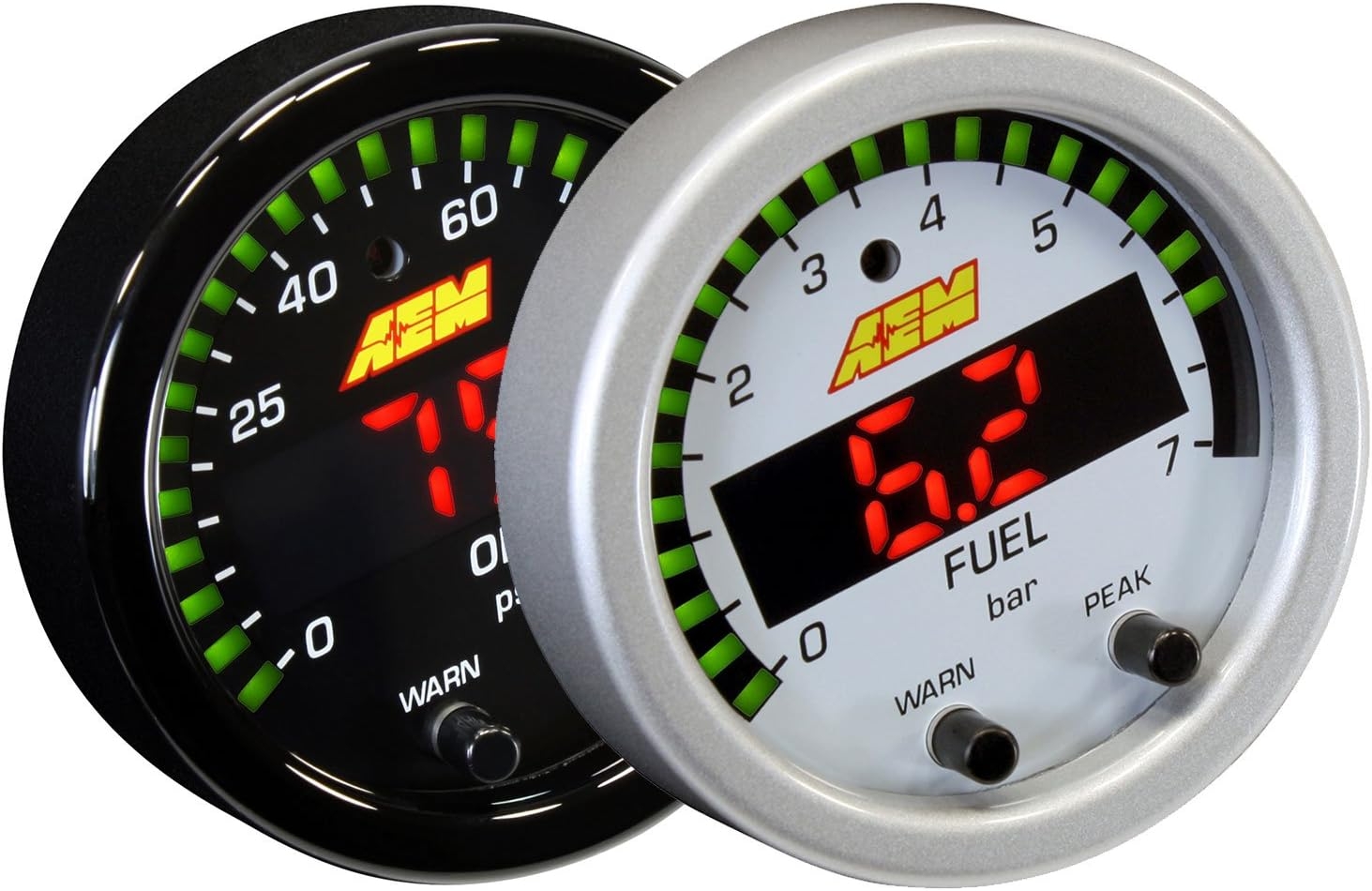 AEM s digital display gauge delivers unsurpassed accuracy and visibility. Each gauge includes 24 color-coded (Red, Green, Yellow) LED lights that change from green to yellow to red for immediate reference to the measured parameter, and an integrated thee-digit display that reveals real-time operating conditions.
