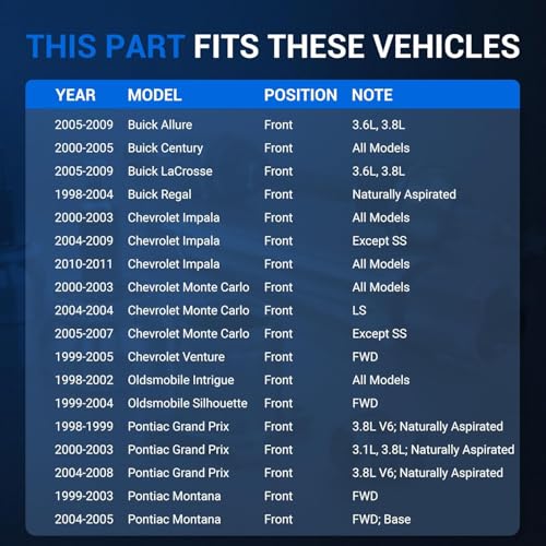 COMPATIBILITY – Replacement for Buick Allure 2005-2009, Century 2000-2005, LaCrosse 2005-2009, Regal 1998-2004; Compatible with Chevrolet Impala 2000-2011, Monte Carlo 2000-2007, Venture 1999-2005; Compatible with Oldsmobile Intrigue 1998-2002, Silhouette 1999-2004; Compatible with Pontiac Grand Prix 1998-2008, Montana 1999-2005. For more details, please check the outline below