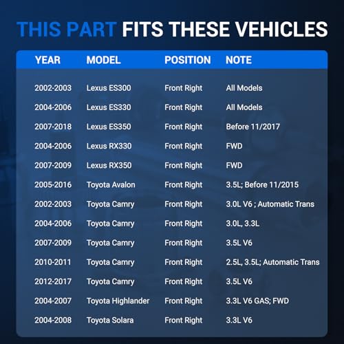 COMPATIBILITY – Replacement for Lexus ES300 2002-2003 | ES330 2004-2006 | ES350 2007-2018 (Before 11/2017) | RX330 2004-2006 (FWD) | RX350 2007-2009 (FWD), Replacement for Toyota Avalon 2005-2016 V6 3.5L (Before 11/2015) | Camry 2002-2003 V6 3.0L (Automatic Transmission) | Camry 2004-2006 V6 3.0L/V6 3.3L | Camry 2007-2017 V6 3.5L | Camry 2010-2011 L4 2.5L (Automatic Transmission) | Highlander 2004-2007 V6 3.3L (Gas, FWD) | Solara 2004-2008 V6 3.3L
