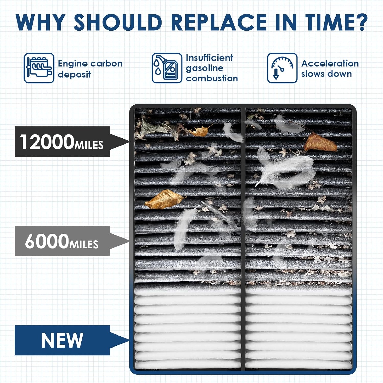 • [Replacement compatible Note] Please check if this filter matches your car by following listing fitment guide or product description compatible list. Recommended replacement check every 12,000 miles.