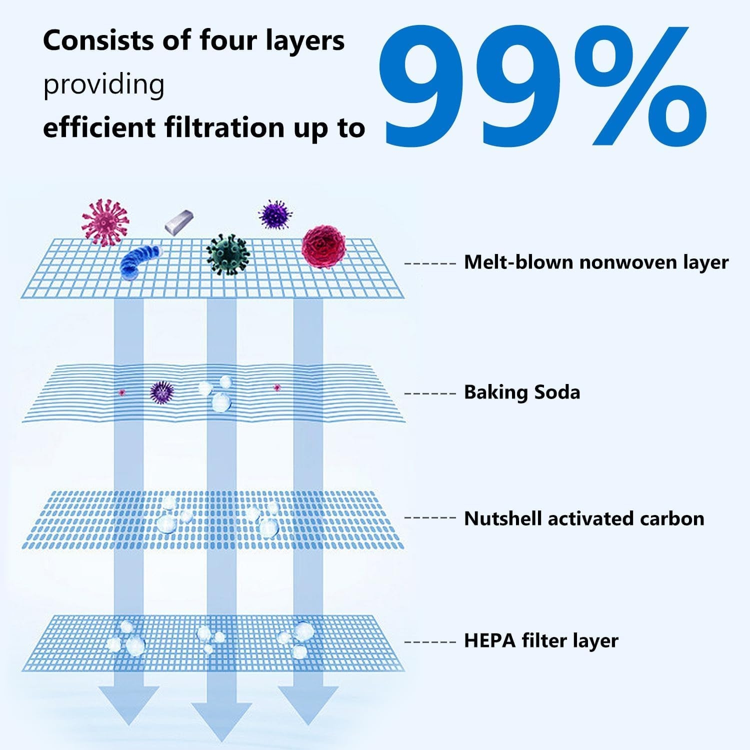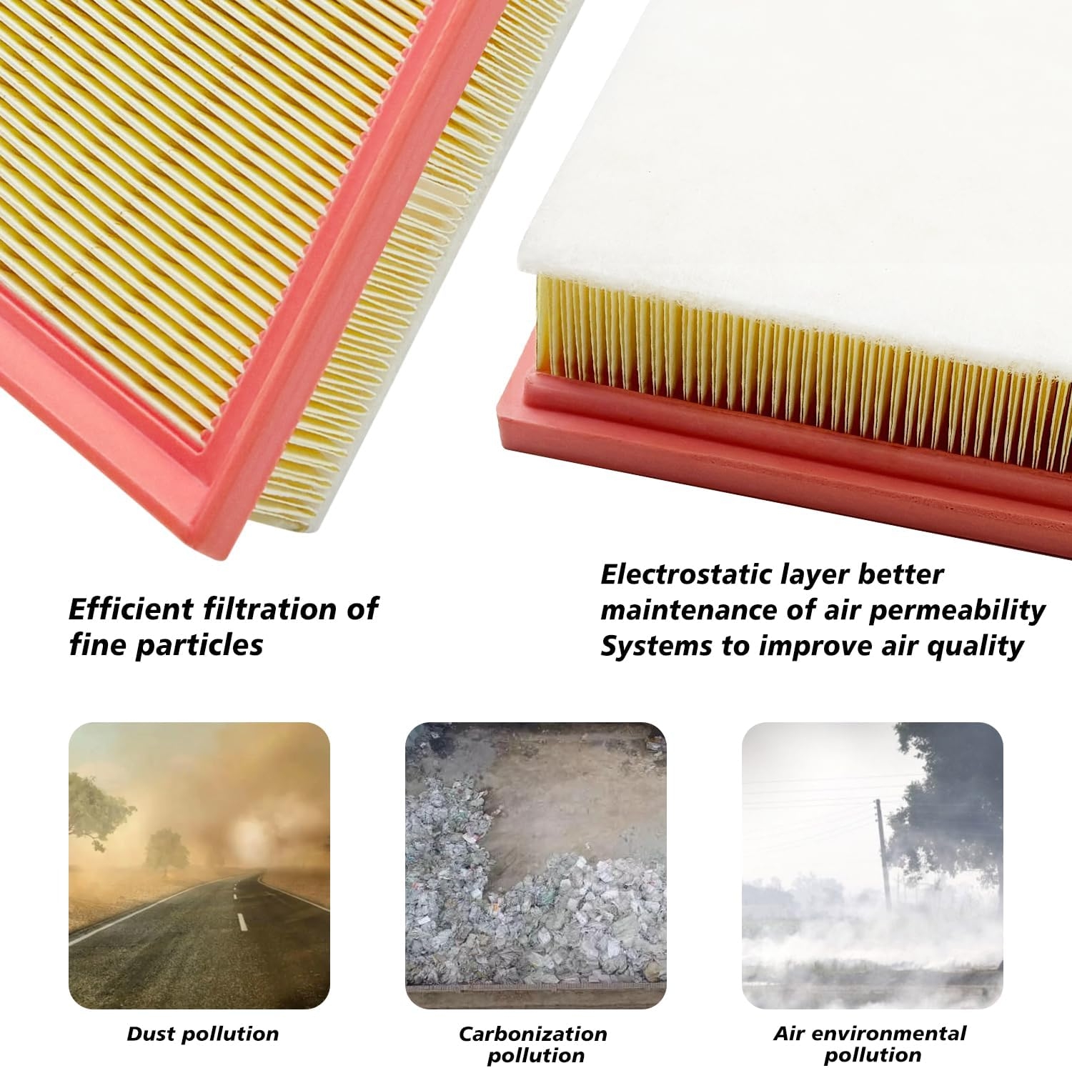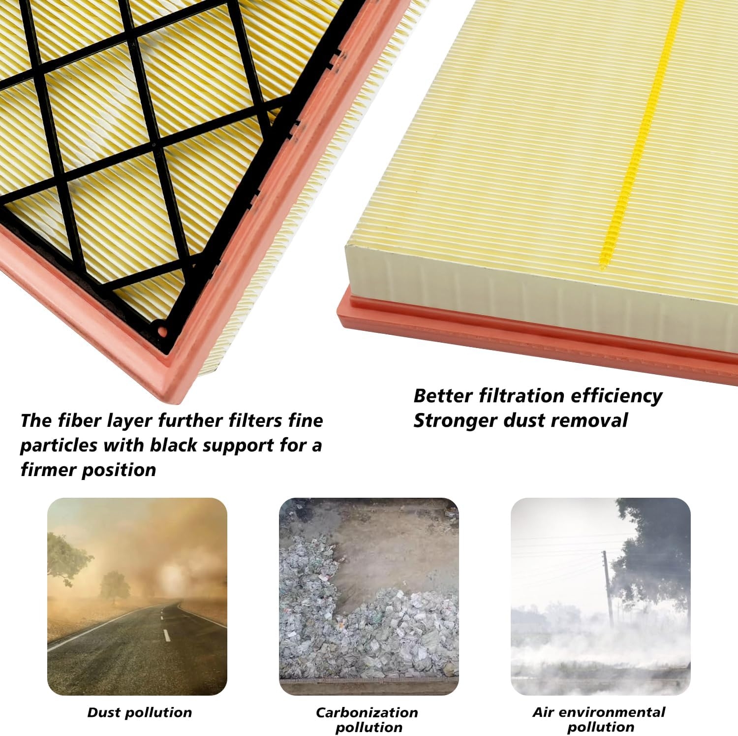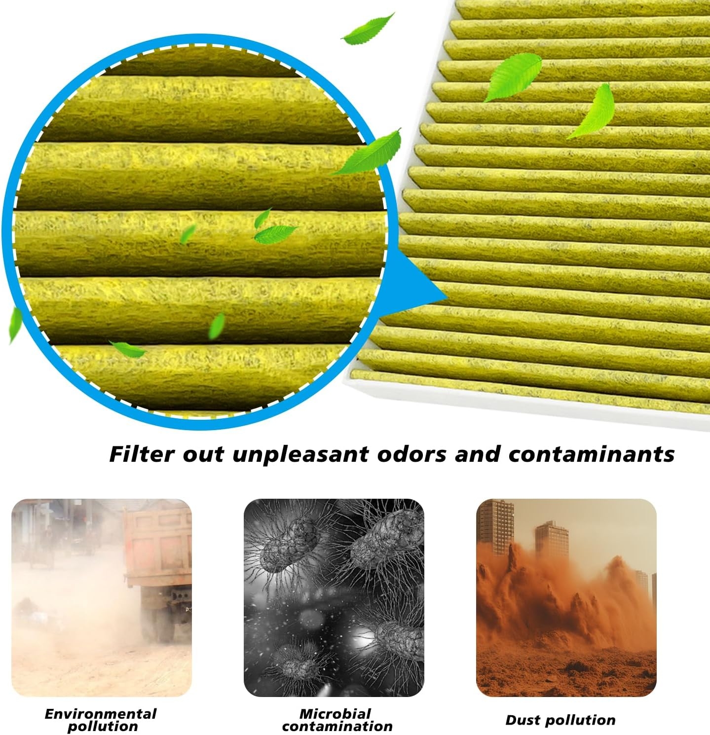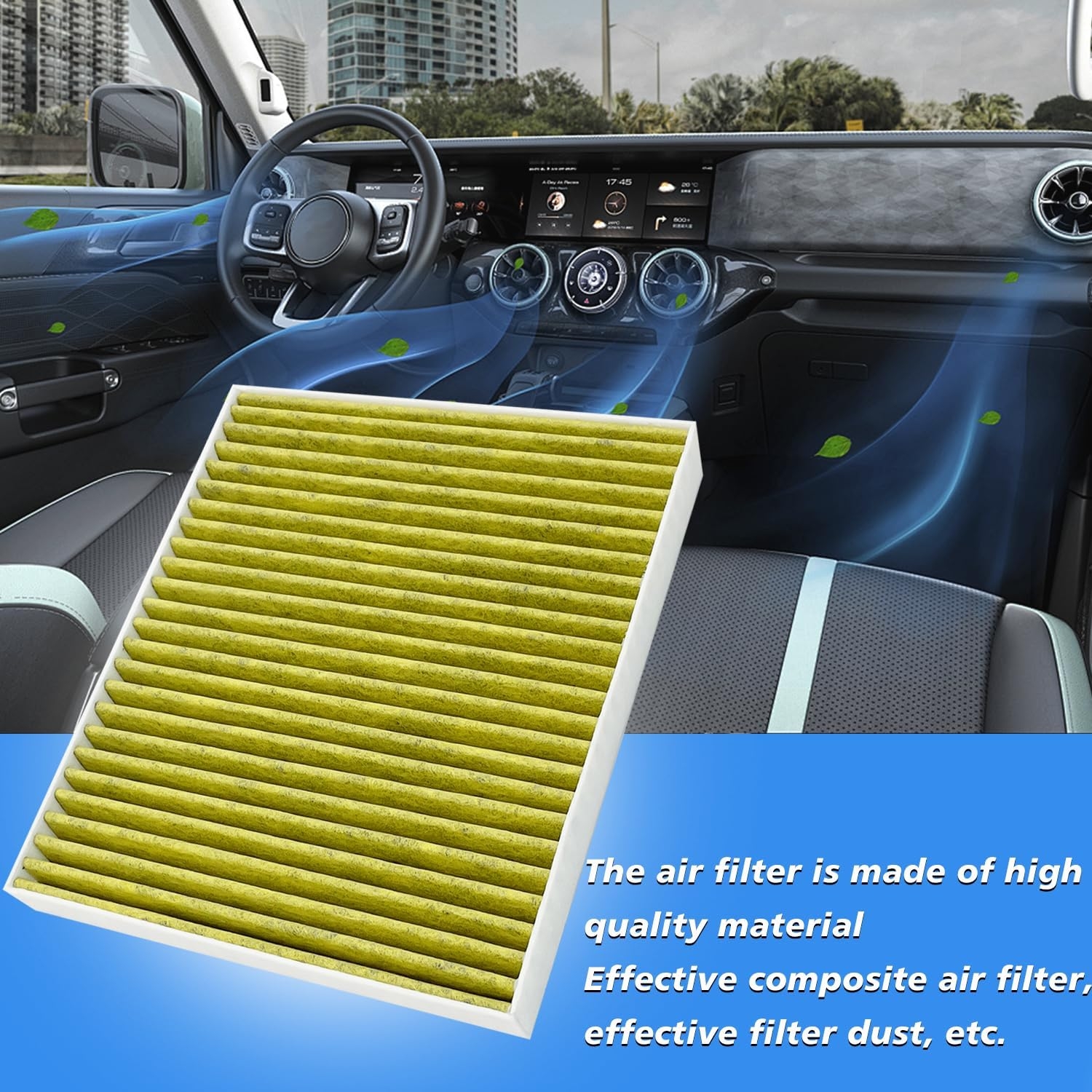 Our cabin air filter uses high quality carbon cloth made of coconut shell and contain activated carbon, and the newest HEPA design four-layer filtration technology to filter 99% of dust, pollen, odors and other bad particles.