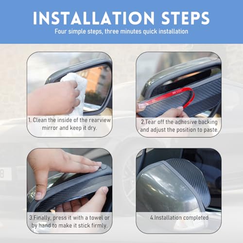【Easy to Install】: Installation is so simple that it will take you only a few seconds. It is very important to wipe off dust and dirt from the mirrors before installation. Simply peel off the protective layer on the back of the mirror cover, apply the cover and press it for a while.