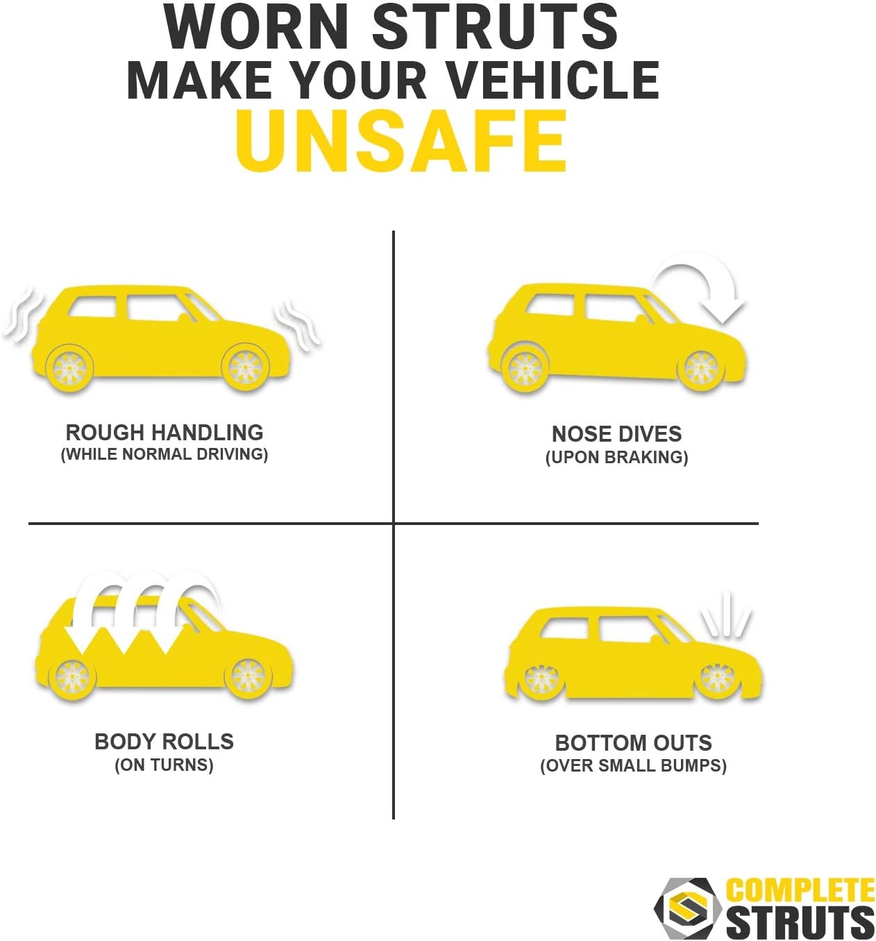 These COMPLETESTRUTS assemblies replace everything that wears together, restoring proper suspension geometry and balance.