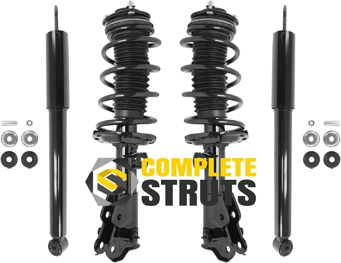 When you order the front complete struts and rear shocks set, you take the hassle out of rebuilding your old struts and ensure all components are new. These fully assembled strut assemblies, with all new parts, ensure you have eliminated the possibility of faulty or compromised components, such as springs, mounts, bearings and/or isolators going back on your suspension.