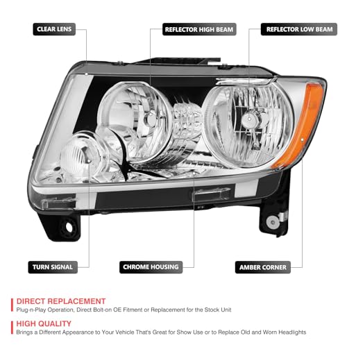 Specification: DNA MOTORING OE Style Front Left Headlight Compatible With Jeep Grand Cherokee 2011-2013, CH2502224, Chrome Housing/Amber Corner, OEM-HL-0071-L