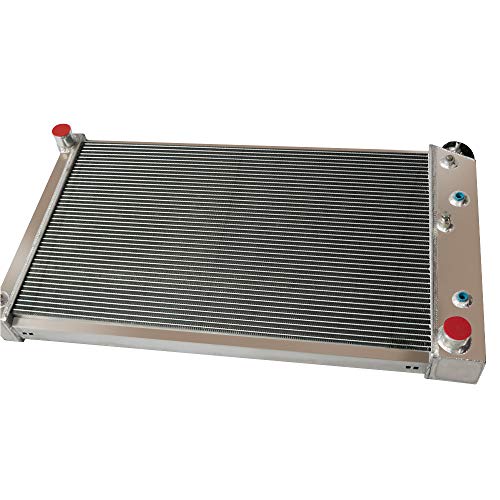 ECMRAD Aluminum Radiator is produced and designed to provide maximum cooling efficiency to prevent engine cooling failure. It is made of full aluminum light-weight, and high-heat transferring aluminum features a tube and fin design that, dramatically increases surface area that enables the heat to dissipate more efficiently. It has an increased durability over the factory plastic end tank radiator, and much inmprovwed engine cooling. Most importantly, it has a much higher capacity for coolant than stock ones, which means that your cooling system will be more efficient and will be more resistant to temperature surges in racing applications. This Aluminum Radiator Compatible for: For 1971-1990 Chevy Caprice For 1968-1973 Chevy Chevelle For CHEVY GM CARS 28 WIDE CORE For 1973 -77 Chevy Truck (28 Wide x 17 Tall Core) For Chevy Cars Caprice (fits 28 wide core) For 68-77 Chevy El Camino For 68-77 For Chevy Chevelle Malibu For 1971 1972 Chevy Biscayne For 67 – 69 Buick Riviera For 66-77 Olds Cutlass For CADILLAC OLDSMOBILE GM CARS 28 WIDE CORE For 1973-1980 K5 Blazer / Blazer For 72-80 Chevy / GMC G & P-Series Vans For 70-77 Chevy Monte Carlo For 73-80 Blazer / Jimmy For 68-85 GM 28 Core For 67 68 69 70 71 72 Buick Skylark For 1974 1975 Pontiac LeMans Radiator Size Details: Core Size: 17 High x 28 1/4 Wide x 1.80 Thick Overall Size: 18 5/8 High x 33 Wide x 3.9 Tank Thickness Hose Locations & Sizes: In Driver- 1-1/2 / Out Passenger- 1-1/2 Trans Cooler: Included- 1/2 20 STRAIGHT THREAD G1/4 Surface finish :Aircraft 5057 grade aluminum tank & core Petcock Drain :OEM style brass petcock drain Radiator Cap :CNC machined filler neck and cap Package Included: 1 X 3-Row Aluminum Radiator w/ Radiator Cap in a Carton box