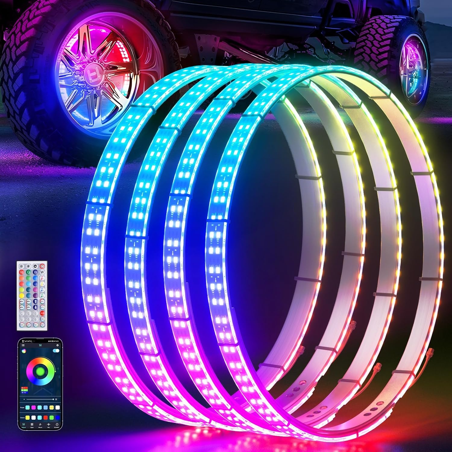 Featuring dual-row LEDs, RGB “dream-chasing” animations, full app control, remote control, and even turn signal & brake-light integration, these rings bring next-level visual flair to trucks, SUVs, and cars.