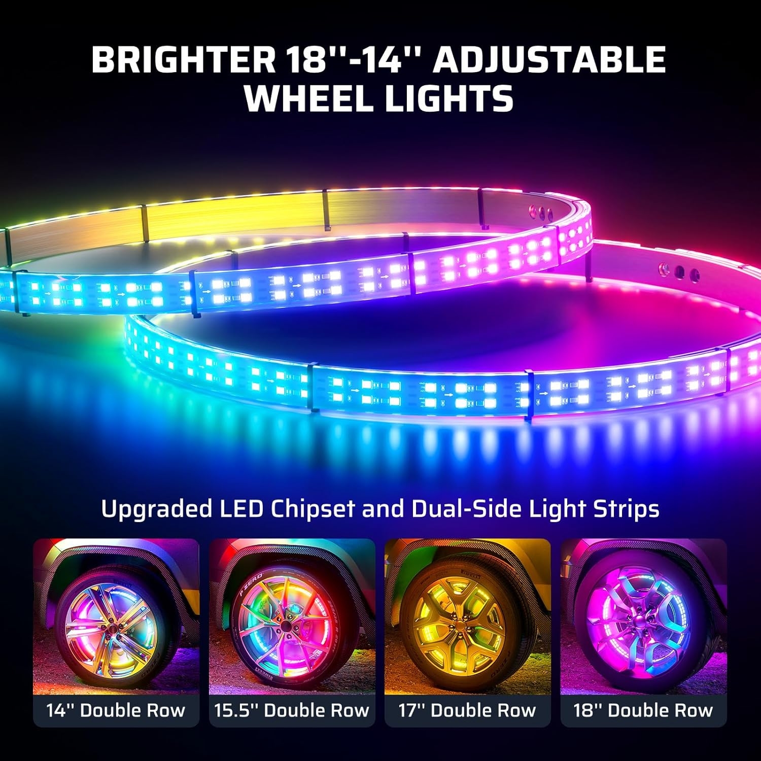 The Ehaho 17″ Double Row RGB Dream Chasing Wheel Lights are built for enthusiasts who want maximum wheel illumination with modern features like app control, music sync, and signal integration.