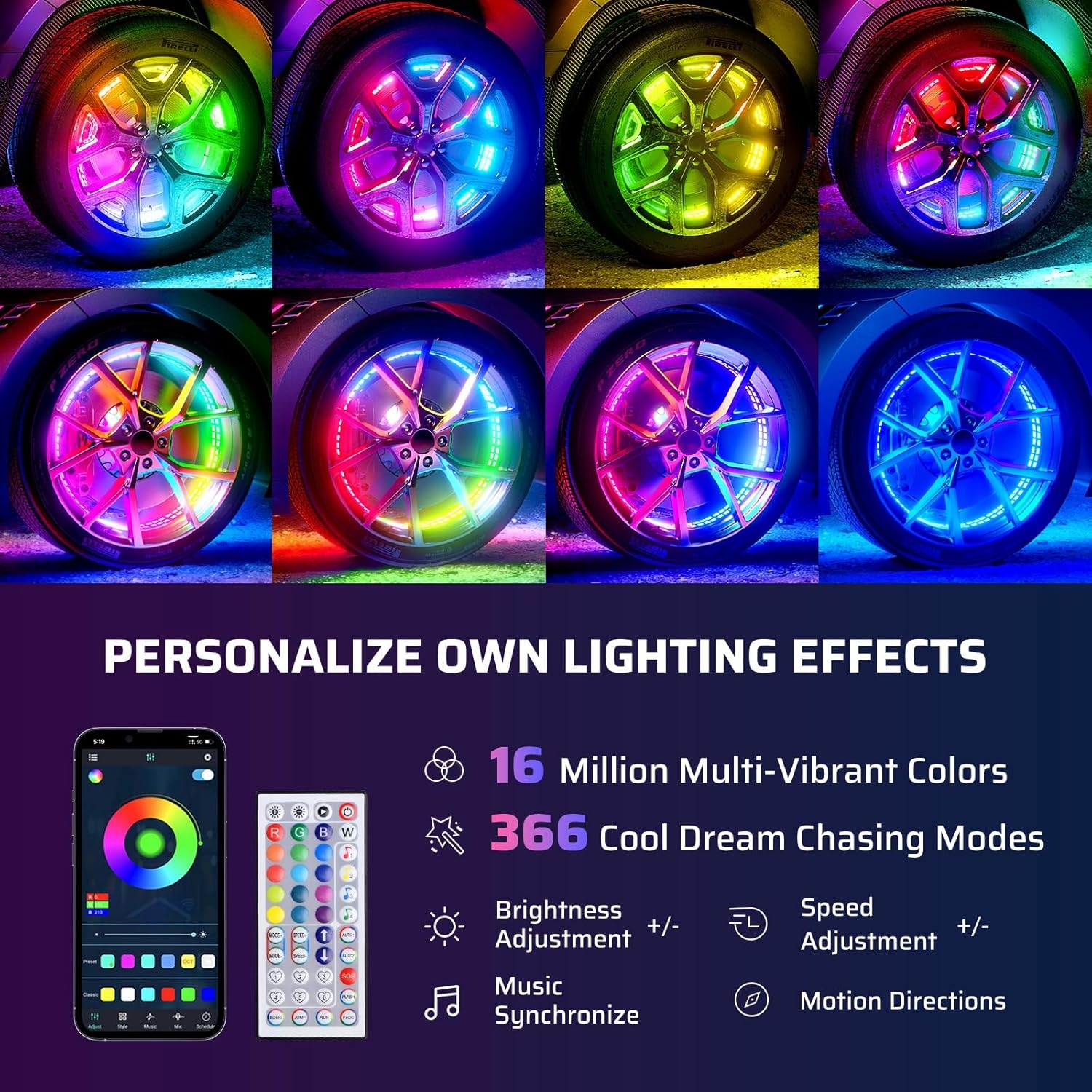 • 【Dual Control and Music Synchronization】Easily customize color, brightness, Speed, and pattern settings via the App or remote. Built-in sound sensors, wheel lights can synch your phone’s music beat or your voice. Captivating all eyes during your rides. (Tip: Before using the music synch function, set the sound sensitivity of the external mic in the app)