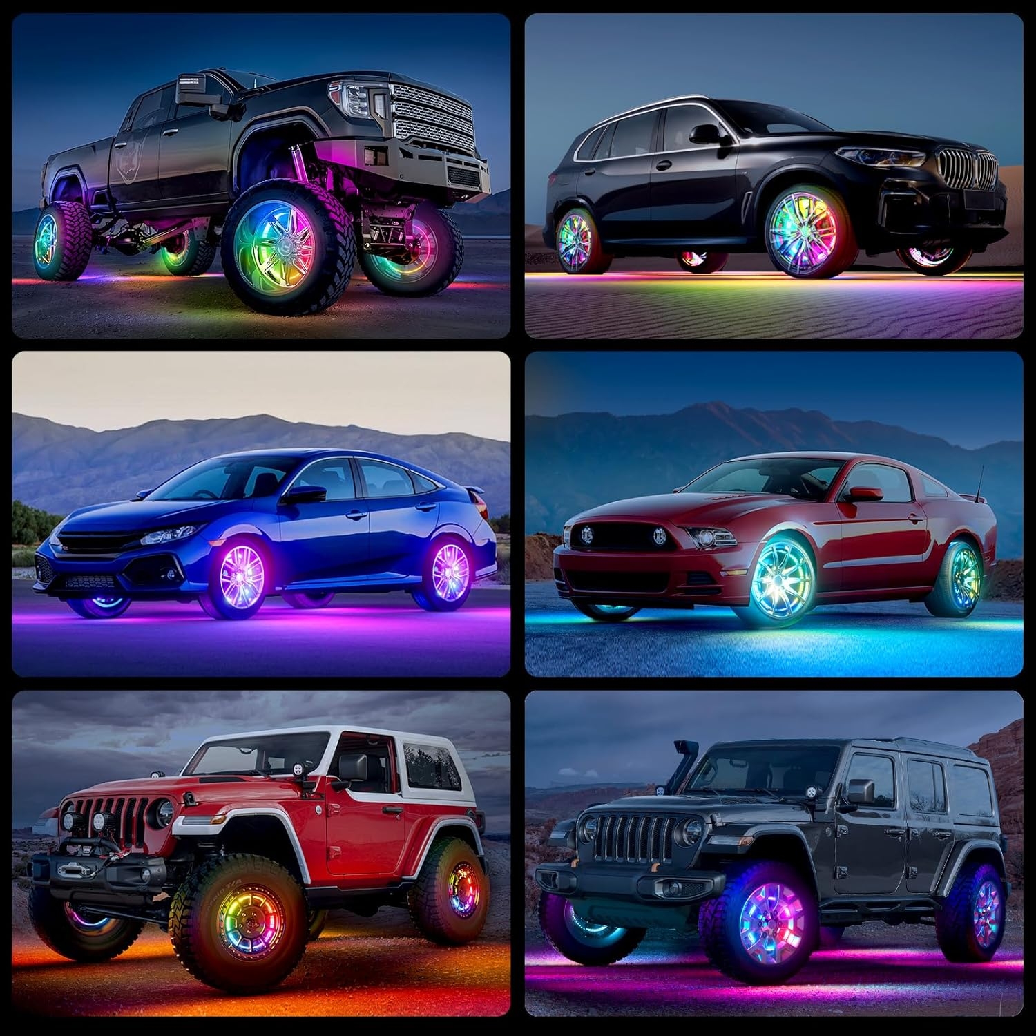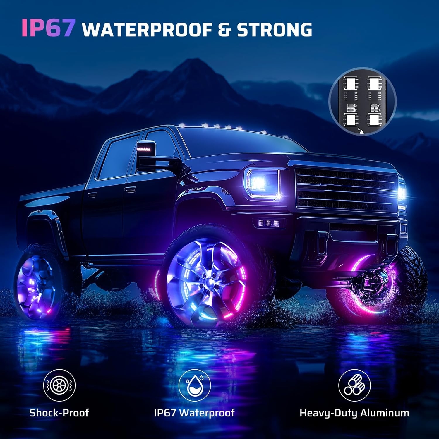 • 【Strong and IP67 Waterproof】Each truck wheel light is constructed of heavy-duty die-cast aluminum, which is shock-proof, rust-proof, and strong. Wrapped in a silicone coating, LED wheel lights boast exceptional high water resistance and uniform lighting effect. Drive with confidence in any extreme weather conditions
