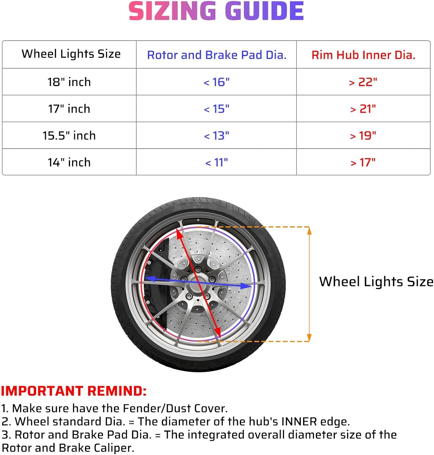 • 【Easy to Install】Suitable for Rotor Brake Calipers Pad Dia≤15″, Rim Inner Edge Dia≥21″. Fit for Car, SUV, Jeep, Truck, Golf Cart, etc. vehicles. The rotor must be provided with a fender or dust cover. Comes with all hardware and wires needed, just drill and mounted to the Brake Rotor Dust Shield and connect wires.(Please connect wheel lights to rocker switch first instead to battery directly,avoid draining battery.)