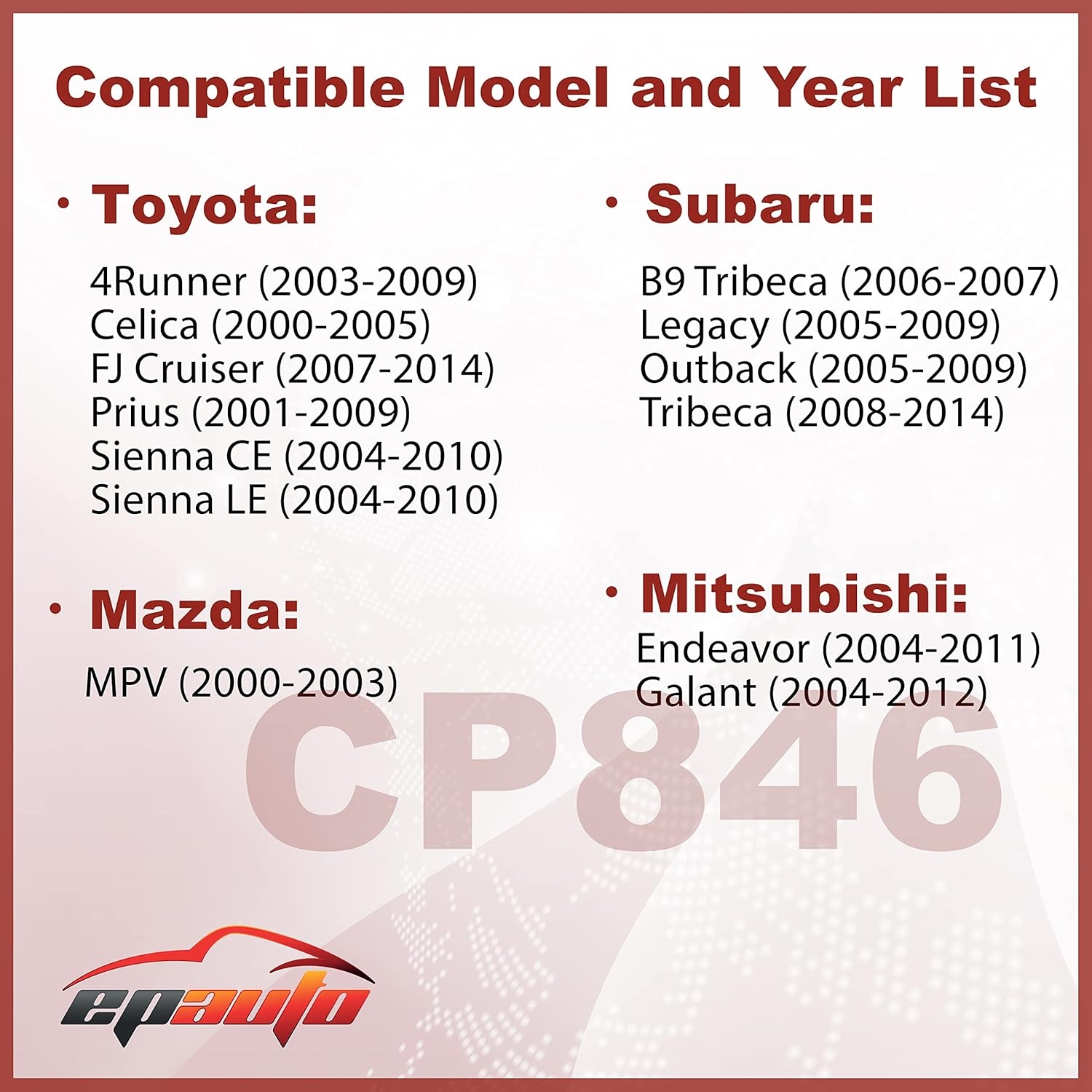 • Compatible with Mitsubishi Endeavor (2004-2011), Galant (2004-2012); Compatible with Mazda MPV (2000-2003)
