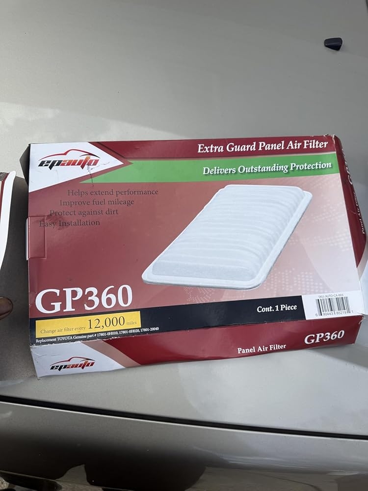 I recently replaced the engine air filter in my Lexus using the EPAuto GP360 (CA9360) Rigid Panel Engine Air Filter, and I am extremely pleased with the product. This filter is an excellent option for anyone looking for a high-quality replacement at an affordable price. Plus, you can put it on Subscribe & Save, creating a built-in reminder for when it needs to be replaced.Perfect Fit and Easy Installation:The EPAuto GP360 fit my Lexus perfectly. It was easy to install, and I had it replaced in just a few minutes with no issues. The filter is designed to match OEM specifications, and it fit snugly in place, making it a hassle-free replacement.Great Performance:Since installing this filter, I’ve noticed an improvement in my car’s overall performance. My engine feels like it’s breathing better, with smoother acceleration and a slight increase in fuel efficiency. I drive on a lot of dirt roads and it’s clear that this air filter is doing its job of keeping the engine’s air intake clean and free of debris.High-Quality Construction:The build quality of this air filter is impressive. It’s made with sturdy materials and offers excellent filtration. I trust it will last a long time and provide my engine with the protection it needs to perform optimally. It’s also great that this air filter is highly rated for efficiency, which gives me peace of mind knowing my car is getting the best care.Affordable and Reliable:One of the best aspects of the EPAuto GP360 filter is its affordability. It provides all the benefits of a premium air filter without the high cost associated with branded parts. It’s a perfect solution for those who want to save money on car maintenance while still using a reliable product.