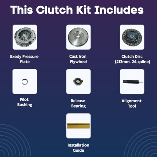 Complete Clutch Replacement Kit: This EXEDY-EFT clutch kit consists of all the essential components: Brand New Exedy Pressure Plate, Clutch Disc (213mm, 24 spline), EFT Flywheel, Release Bearing, Pilot Bearing, Alignment Tool and a Basic Installation Guide. It offers everything you need for a seamless repair in one package