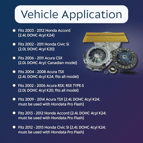Vehicle Compatibility: Engineered to meet or exceed OEM specifications, this clutch kit is designed to fit in 2006-2011 Acura CSX, 2002-2006 Acura RSX, 2004-2012 Acura TSX, 2003-2012 Honda Accord, and 2002-2015 Honda Civic Si, with specific fitment for 2.0L and 2.4L K-series engines, ensuring an easy and hassle-free installation without any additional modifications required to your vehicle offering a precise fit for enhanced performance