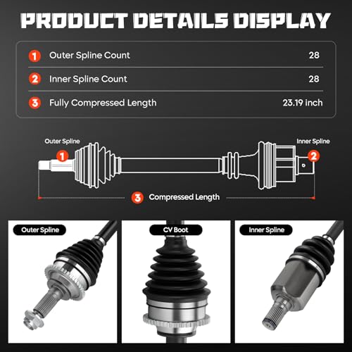Specifications: Installation location: Front Left; Compressed Length: 23.19 inch; Inner Spline Count: 31 inch; Outer Spline Count: 28 inch; ABS Spline: 44T Axle Nut Included: Yes; Axle Nut Thread Size: M22x1.5