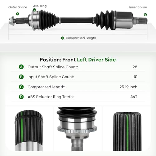 [Specifications]: ① Location: Front Left (Driving force Facet); ②ABS Shaft Spline Count: 44T; ③ Axle Nut Thread Size: M22×1.five; ④ Compressed Duration: 23.19 inch; ⑤ Outboard Spline Amount:28; ⑥ Input Shaft Spline Count: 31, Outboard Joint Sort: Splined