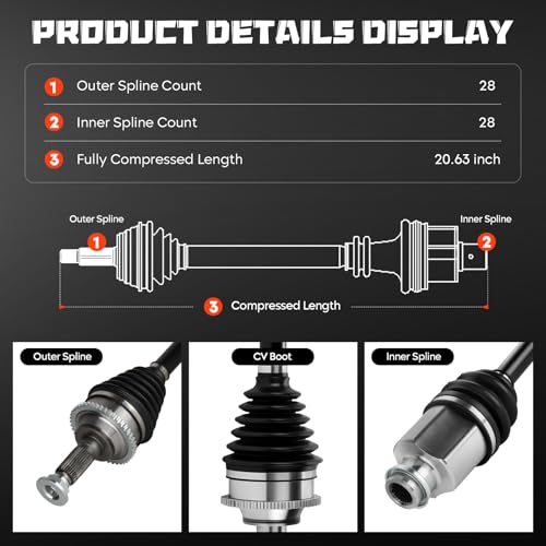 Specifications: Installation location: Front Right; Compressed Length: 20.63 inch; Inner Spline Count: 28 inch; Outer Spline Count: 28 inch; ABS Spline: 44T; Axle Nut Included: Yes; Axle Nut Thread Size: M22x1.5