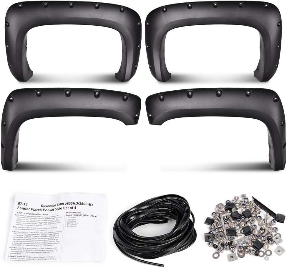 You get what you pay for.. I see alot of negative reviews. But there’s a reason these are under $100. Instructions yes were a total joke. The flares them selves are nice but a bit aggressive for a stock truck. I picked them up for a cheap option to hide the rust on my bed. Install takes about 30 mins per corner to get fitment right and tight. I drilled and used 4 holes on the back flares to actually mount it to my bed so it doesn’t fly off. The fronts use stock wheel well screws so they were decently tight fitting. If you just fly thru the install, they will fit and look terrible. Spend some time…..go slowly and they will line up pretty good. It surely looks alot better then the rusted out bed wheel well.