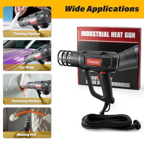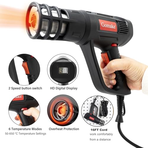 16FT Cord Heat Gun for Vinyl Wrap: with Large LCD Display & Precise Temperature Keep watch over & Overheat Protection &Air Intake Guards Design, use to install car sticker vinyls or easy remove old films or paints from car body/window without residue.