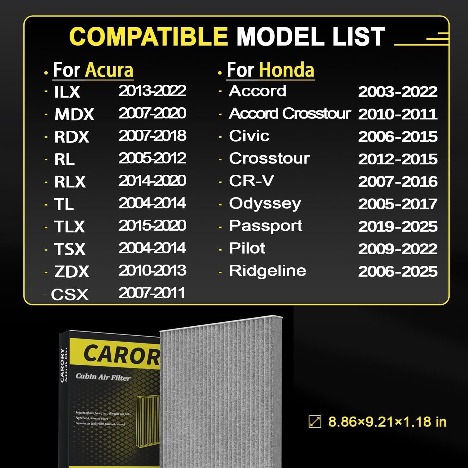 This activated carbon cabin air filter improves interior air quality across a wide range of Honda and Acura models. With a multi-layer filtration design, it traps: