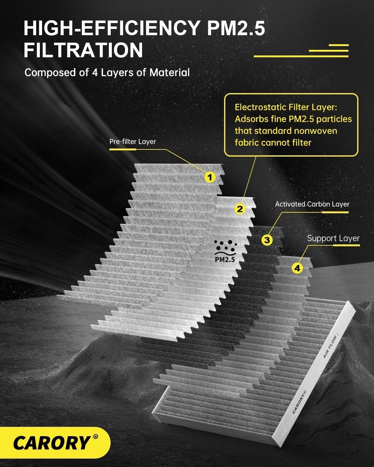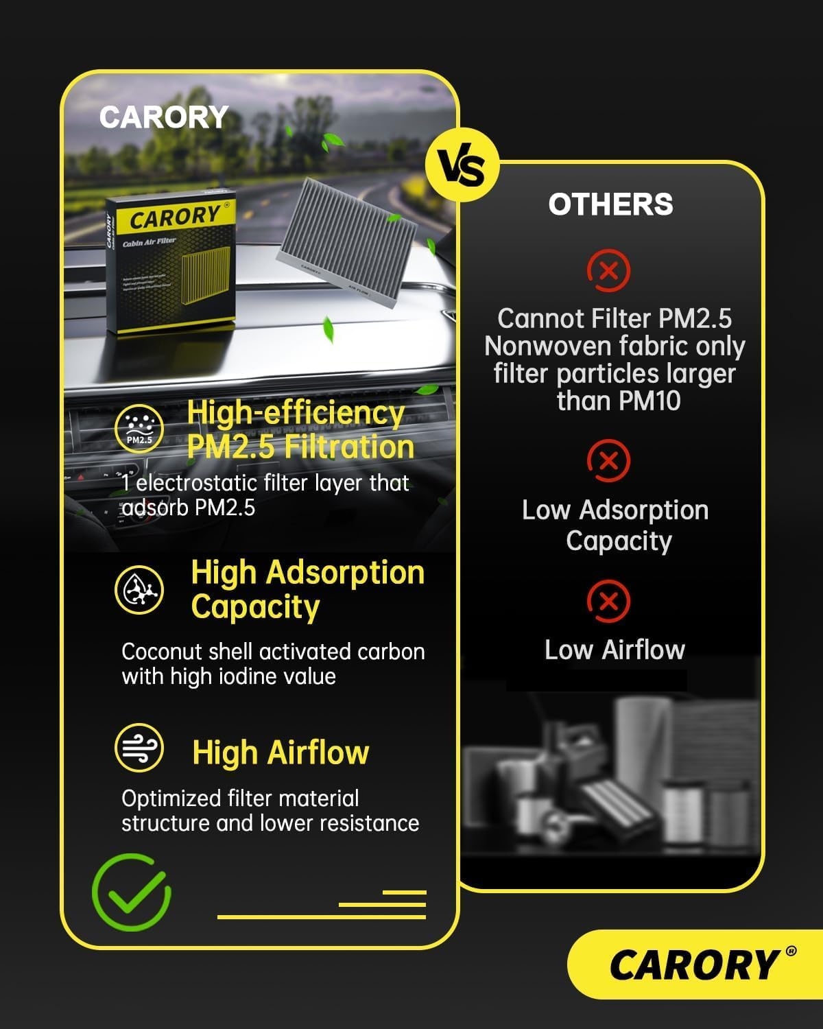 The activated carbon layer absorbs odors and pollution, making your cabin smell less like traffic and more like “somewhat tolerable.”