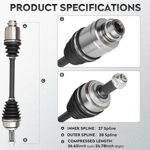 Product Specifications: Front Left and Right CV axle shaft (Driver and Passenger Side); Left Shaft Compressed Length: 26.63inch, Outer Spline: 28, Inner Spline: 27; Right Shaft Compressed Length: 24.78inch, Outer Spline: 28, Inner Spline: 27