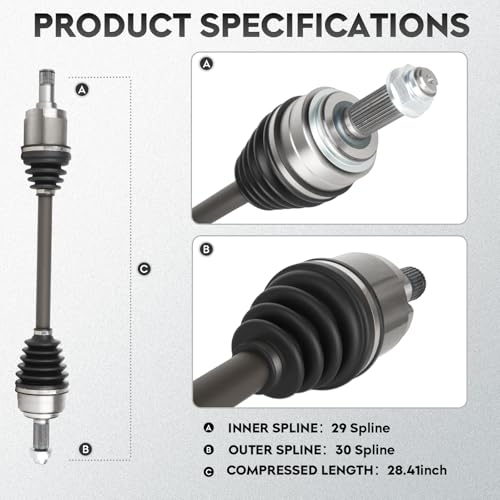 Product Specifications: Front Left CV axle shaft (Driver Side); Compressed Length: 28.41inch, Outer Spline: 30, Inner Spline: 29
