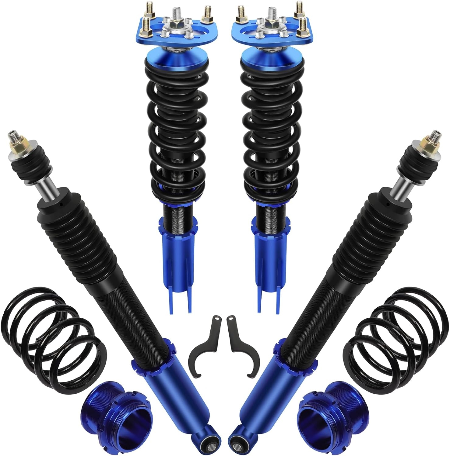 Coilovers combine the spring and shock into a single adjustable unit, allowing ride height tuning while improving suspension control.