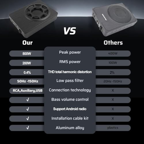 【Subwoofer Specification】Dimensions (inches):14″(L) x 10.2″(W). Thickness: 3″. Frequency Response 20Hz-150Hz. Customize the input sensitivity ranging from 0.12V to 3.5V.Cheap subwoofers distort or shut off when you crank up the volume due to weak power handling and poor thermal management.However, our subwoofer features an efficient Class d amplifier and an oversized voice coil design, capable of handling extreme bass without clipping. Smart Digital Signal Processor prevents overheating and automatically adjusts gain to avoid shutdowns.