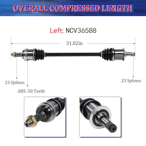 【Feature】NCV36588 (Rear Left), NCV36589 (Rear Right); ① Location: Front Passenger Driving force Side; ② Compressed Length: 31.02in (Left), 28.98in (Right); ③ ABS Tone Ring Included: Yes; ④ ABS Tone Ring Tooth Quantity: 50 Teeth; ⑤ Inboard Joint Type: Male; ⑥ Inboard Spline Quantity: 23; ⑦ Outboard Joint Type: Conventional; ⑧ Outboard Spline Quantity: 23