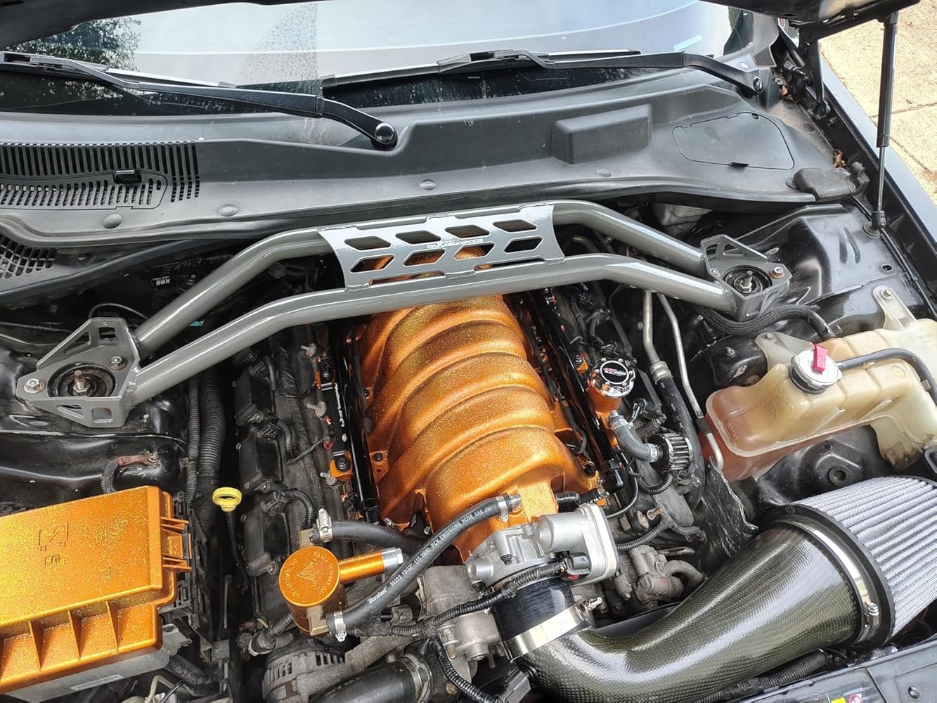 Fit my 2015 Charger Pursuit V8 Awd perfect had to hammer it a little on one side but fit snug! I felt the difference in turning instantly turning corners! I painted mine semi gloss black before installing to match the under-hood area of the car as they only come in grey