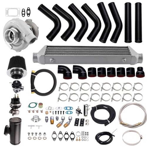 【Package Included】1x T3/T4 Turbocharger, 1x Oil Feed / Return Line, 1x 35/38mm Wastegate, 1x Turbo Intercooler, 1x Tubo Boost Controller, 1x Type-S Blow Off Valve(Random Color), 1x BOV Adapter/pipe, 1x Turbo Piping Kit, 1x Air filter