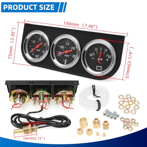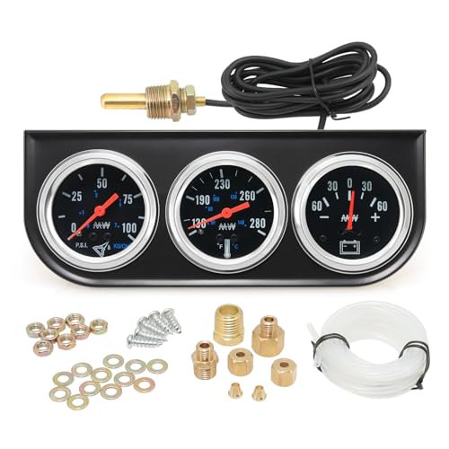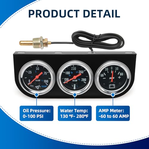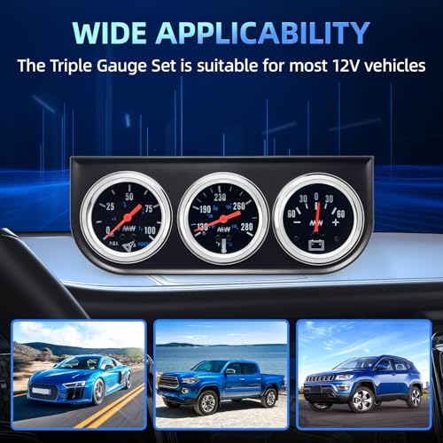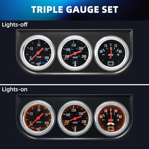 Specification: MH 2inch 52mm Triple Gauge Set, Oil Pressure (0-100PSI) Water Temperature (130°F-280°F) Ammeter AMP (-60 to 60) Car Auto 3 Gauges Cluster Set Automotive Kit Black