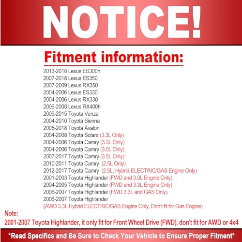 Front Hub Bearing Assembly Have compatibility for 2005-2018 Toyota Avalon, 2004-2017 Toyota Camry, 2001-2005 Toyota Highlander (FWD or 2WD Best), 2006-2007 Toyota Highlander (FWD and GAS Dohc Engine Best), 2004-2010 Toyota Sienna, 2004-2008 Toyota Solara (3.3L Best), 2009-2015 Toyota Venza.