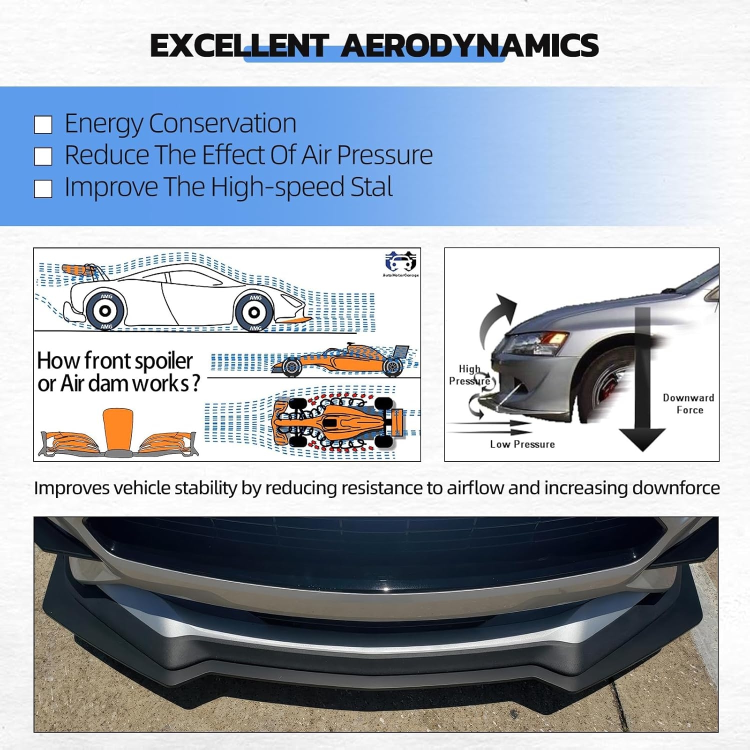 The aerodynamic splitter design helps reduce front-end lift, improving downforce and grip at highway or track speeds. So yes — it looks fast because it is functional.