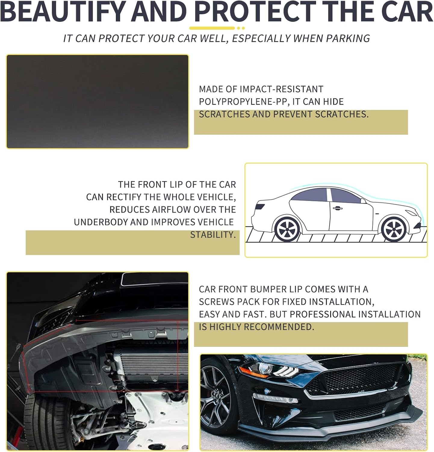 It looks great don’t get me wrong but for the price you can find way better and more secure front lips. The quality is trashy but it’s pretty easy to install. I would definitely recommend looking around American muscle and other websites before buying this